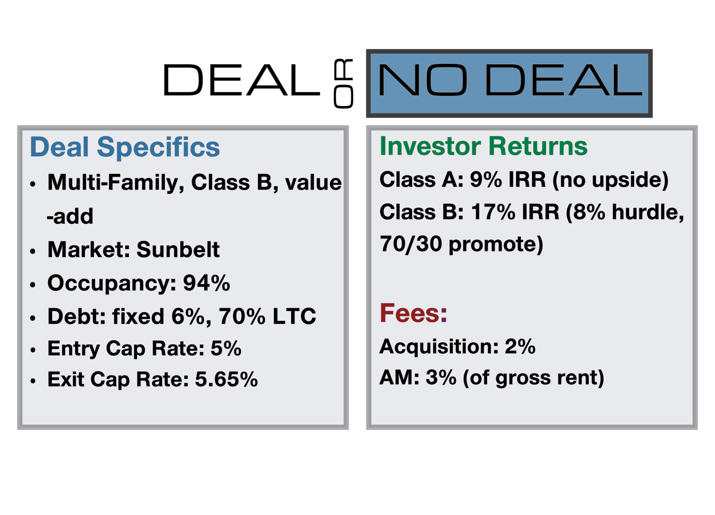 This multifamily deal is being acquired at a 5% entry cap, as a value-add play. Occupancy is high (94% at acquisition), and rent premium for renovated units is fairly low (ROI on capex is around 15%) - I could write another 1,000 word article with a compelling argument as to why it might not be a very good value add deal, but let’s move on.