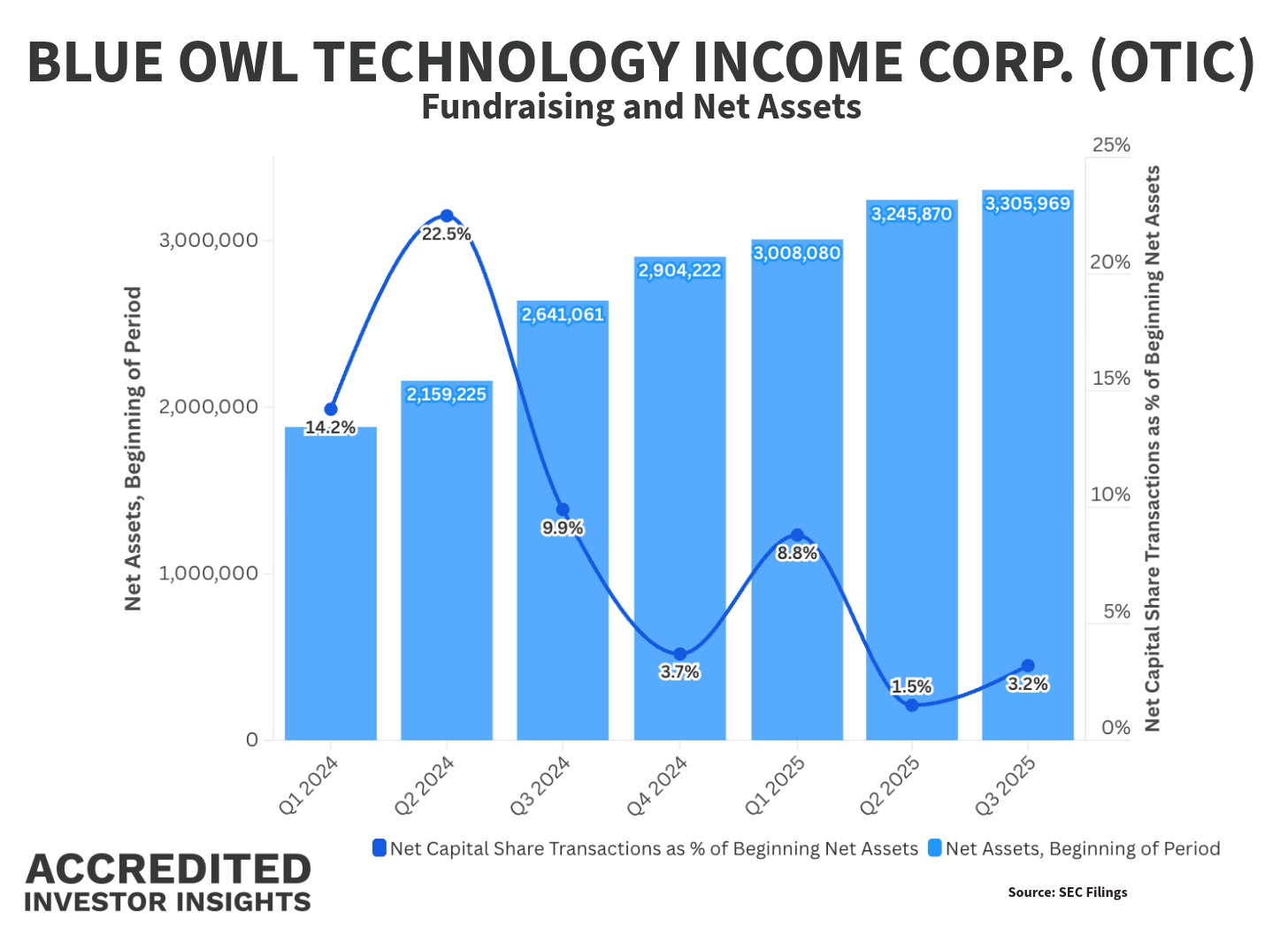It filed its first quarterly report in 1Q22 with $151 million in assets. As of 9/30/25, net assets stood at $3.3 billion.
