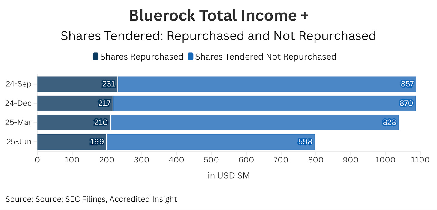 Bluerock Total Income+ (TI+) launched in 2012 as a closed-end fund that operates as an interval fund, meaning it offers limited, periodic liquidity through scheduled redemption windows. But that liquidity mechanism only works when inflows are strong. We’ll come back to that.