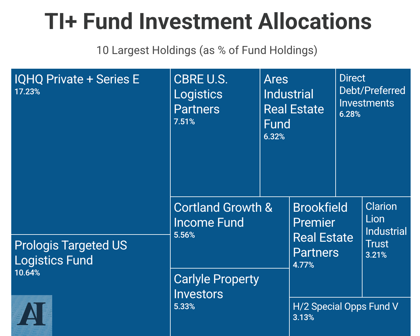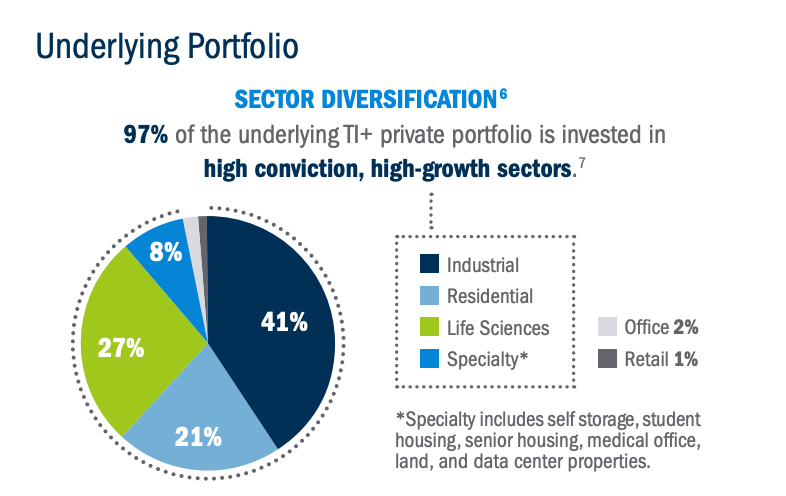 TI+ is not a direct owner of underlying properties: it allocates 100% through third-party private institutional real estate vehicles. This, friends, is a fund-of-funds.