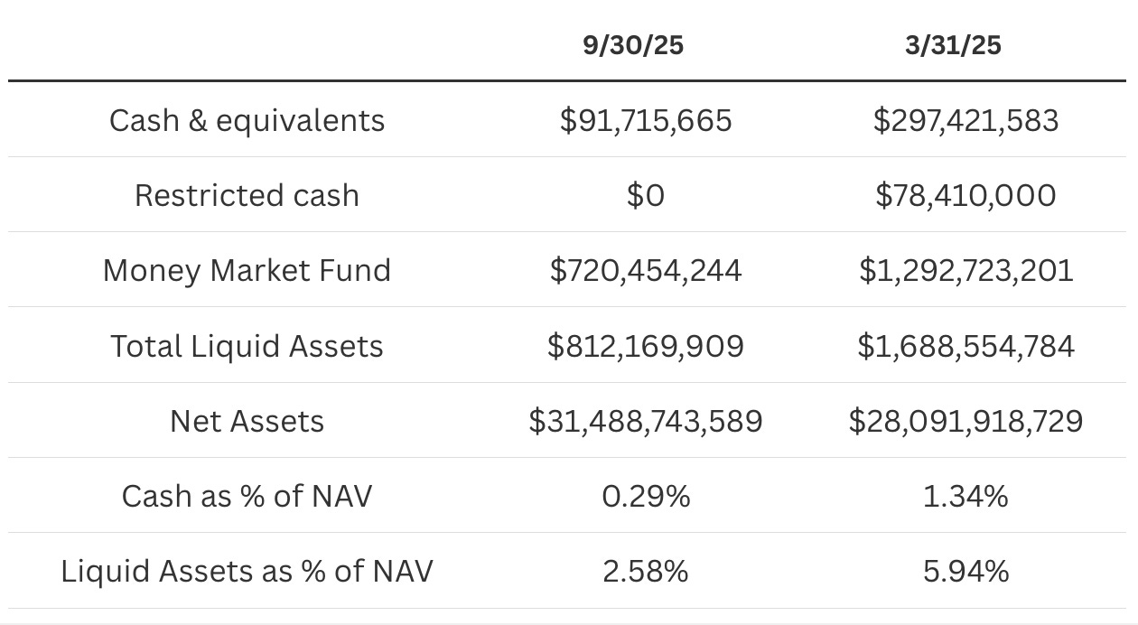 Translation: the fund ended September with $812M in cash and short-term securities on a $31.5B net asset base. That’s 2.58% of NAV.