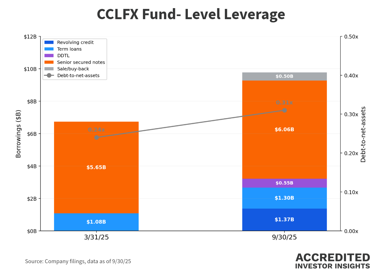 CCLFX maintains a senior secured credit facility to fund lending commitments and new investments. As of September 30, 2025: