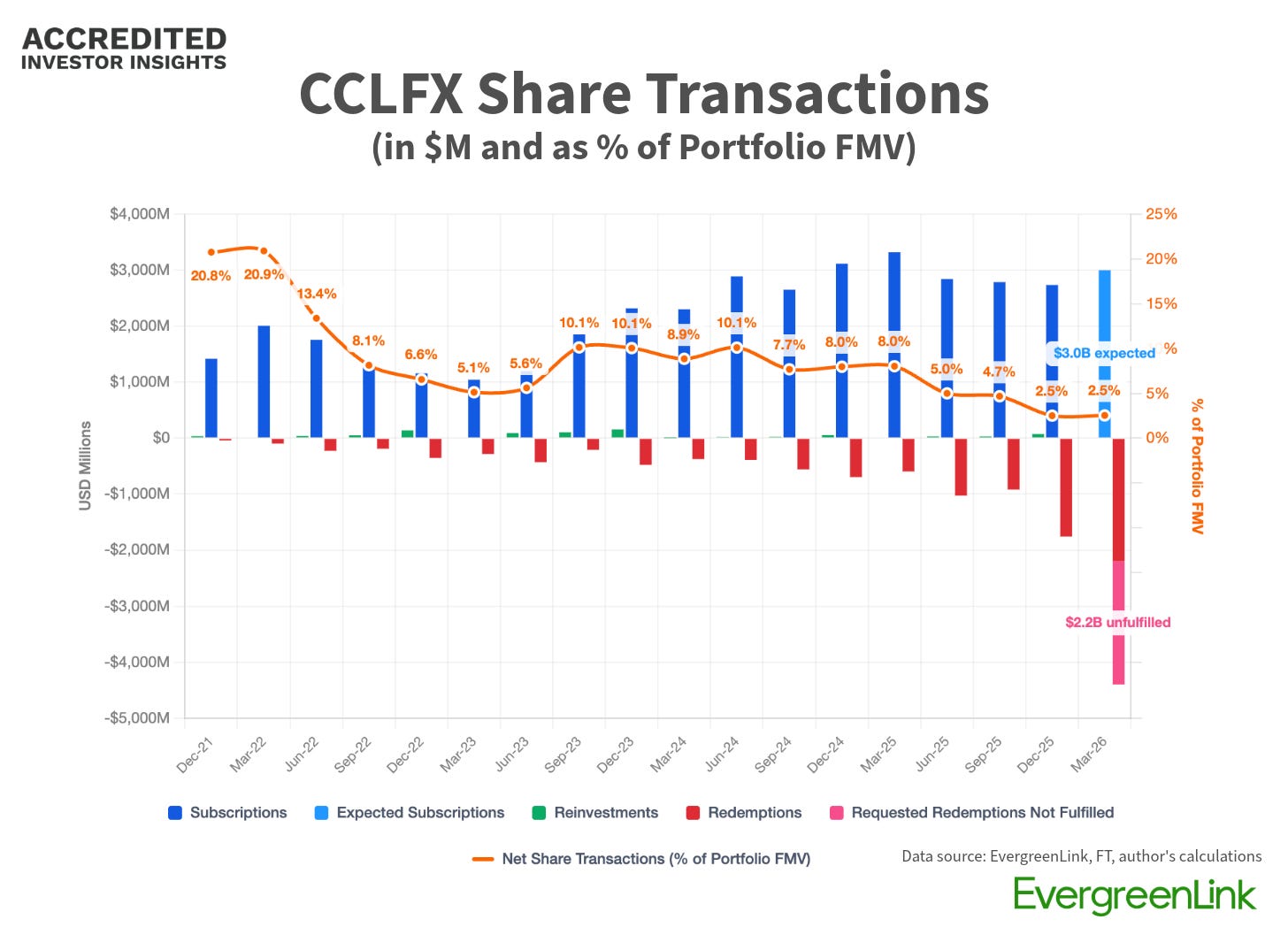 Bloomberg reported that investors requested redemptions of approximately 14% of CCLFX shares in Q1 2026. That’s a record for the fund.
