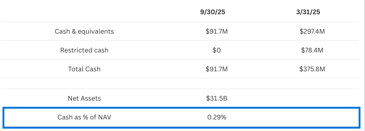 Translation: the fund ended September with $92M in cash on a $31.5B net asset base. That’s 0.29% of NAV.