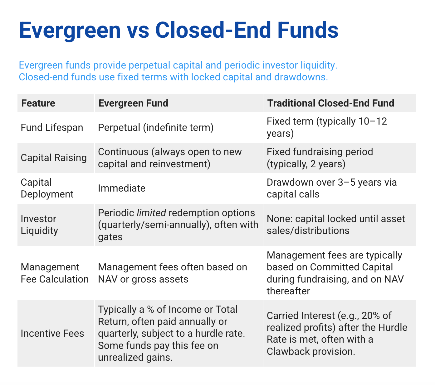 Evergreen funds (AKA open-ended, semi-liquid, or perpetual-capital funds) differ from traditional private equity or credit funds in their structure, term, and liquidity. They’re built to operate indefinitely and accept new capital continuously while offering periodic redemptions.
