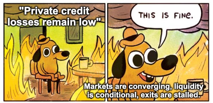 Transparency in private credit is not exactly abundant, given that opacity and illiquidity aren’t bugs; they are the asset class’s essential features. So, even if we accept that the assertion most recent slew of private credit critiques stemmed from comparison to BSL (which is not entirely accurate)¹ the dynamics in the BDC market are tougher to ignore.