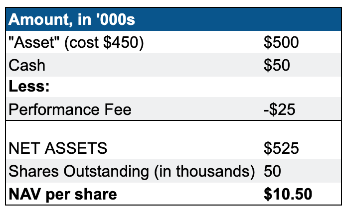 Hereās what the balance sheet looks like. Note what it did to NAV per share, even after the performance fee was paid: