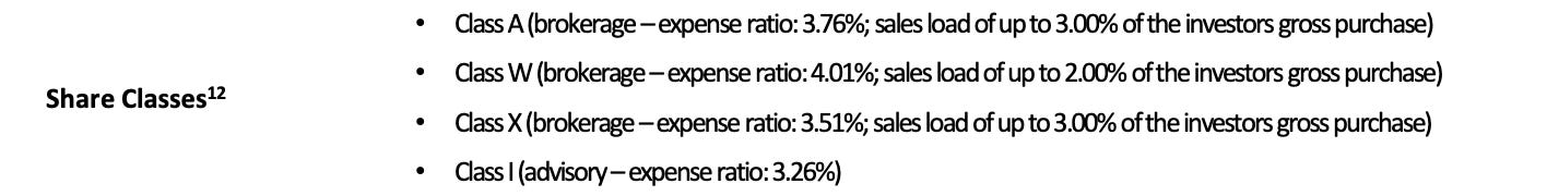 Liquidity: periodic tender offers, typically quarterly, for up to 5% of net assets (subject to board approval). Early repurchases (<1 year) subject to a 2% penalty.