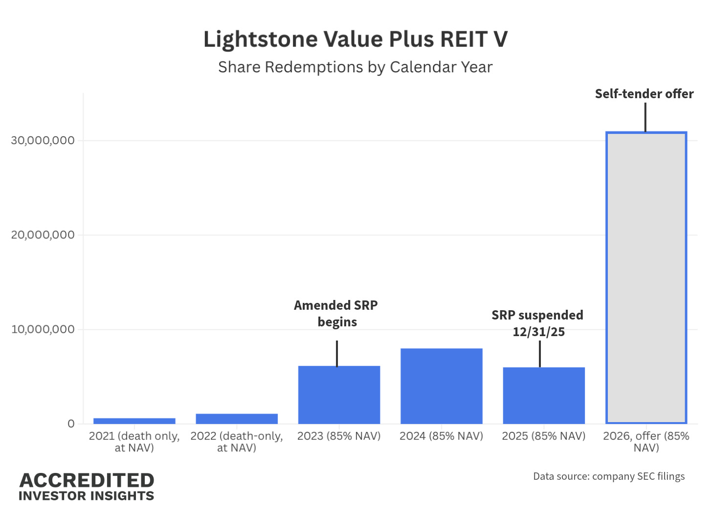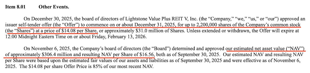 Then, on December 30, 2025, Lightstone announced a self-tender (again at a 15% discount to NAV) for up to approximately $31 million of shares.