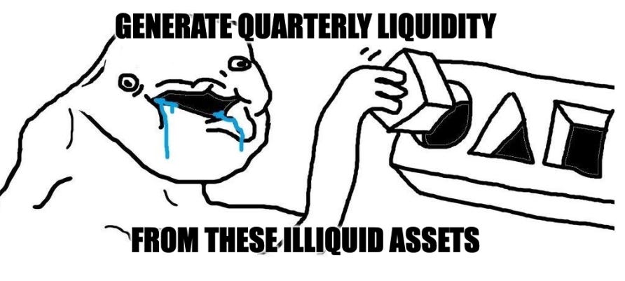 Yes, you can stuff illiquid assets into a semi-liquid vehicle and contort yourself to meet quarterly redemptions. Many funds do just fine, if they can keep raising capital (here’s an example), have a large liquidity sleeve (like this one), or carry minimal leverage.