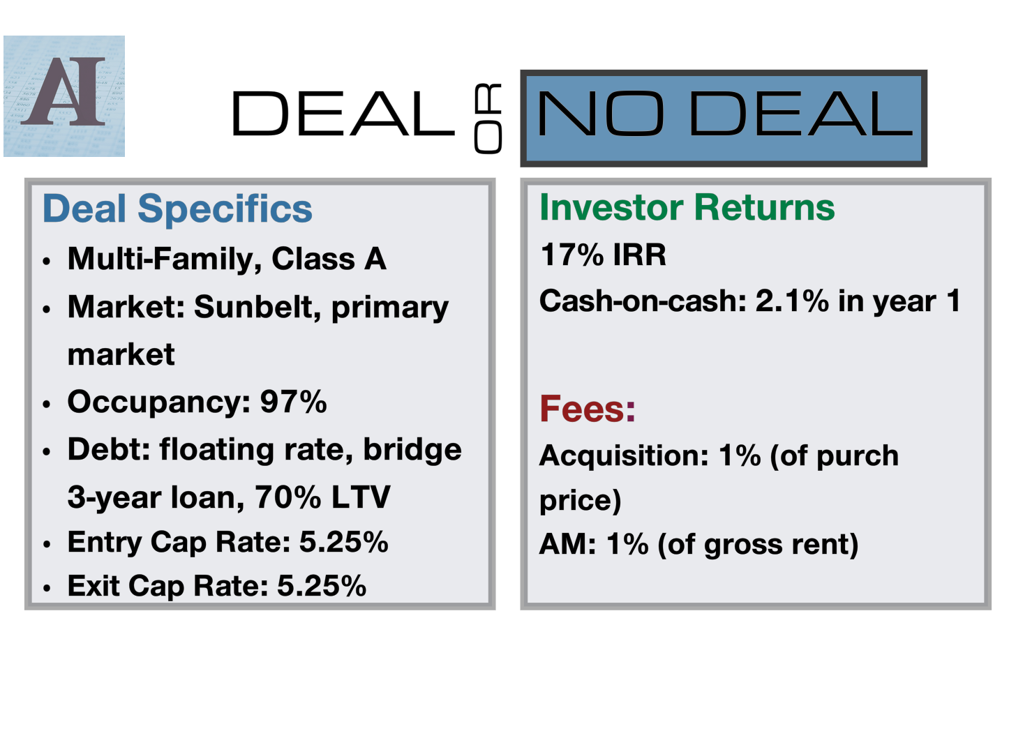 Please remember, the deal is presented as a case study, and all relevant information has been changed to protect the identity of the sponsor. This is not investment advice.