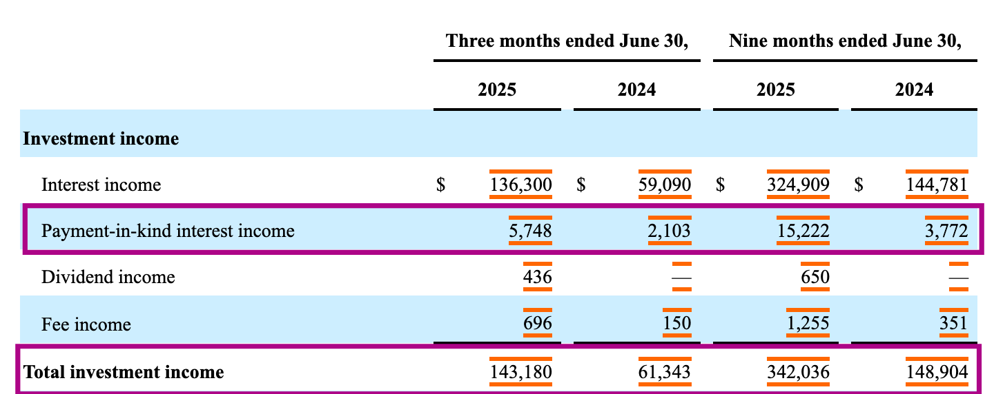 In this fund’s case, PIK made up 4% of total investment income for the quarter ended June 30, 2025. Not alarming on its own, but worth tracking over time, and comparing to peers (here’s how you can track it with help of AI from quarterly statements.