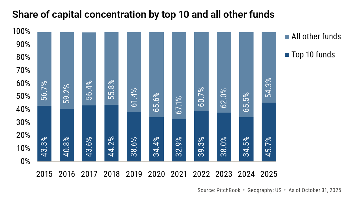 By 2025, the top 10 PE funds captured 45.7% of all capital raised, up from 34.5% in 2024, even as total capital raised across the asset class declined.