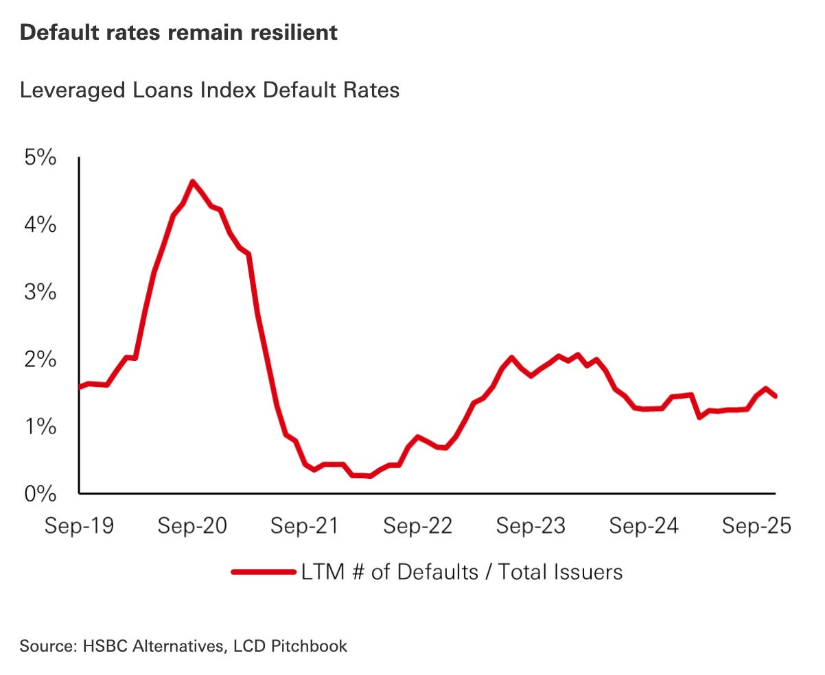 Despite higher rates, defaults in private credit have remained surprisingly muted. Strong aggregate borrower fundamentals and refinancings have extended maturities and kept problems contained.