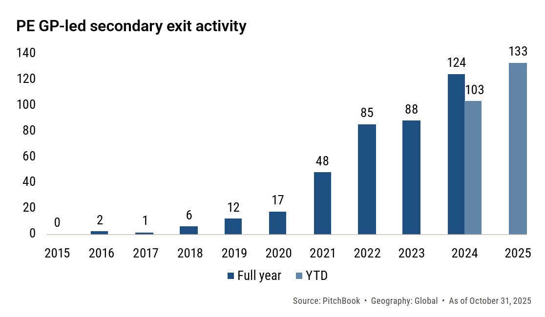➡️ As traditional exit routes stalled, continuation vehicles became the pressure valve for private equity GPs. With IPO windows effectively shut and M&A (mergers and acquisitions) activity slowed, sponsors leaned heavily on GP-led secondaries to generate liquidity to existing LPs and manage aging funds.