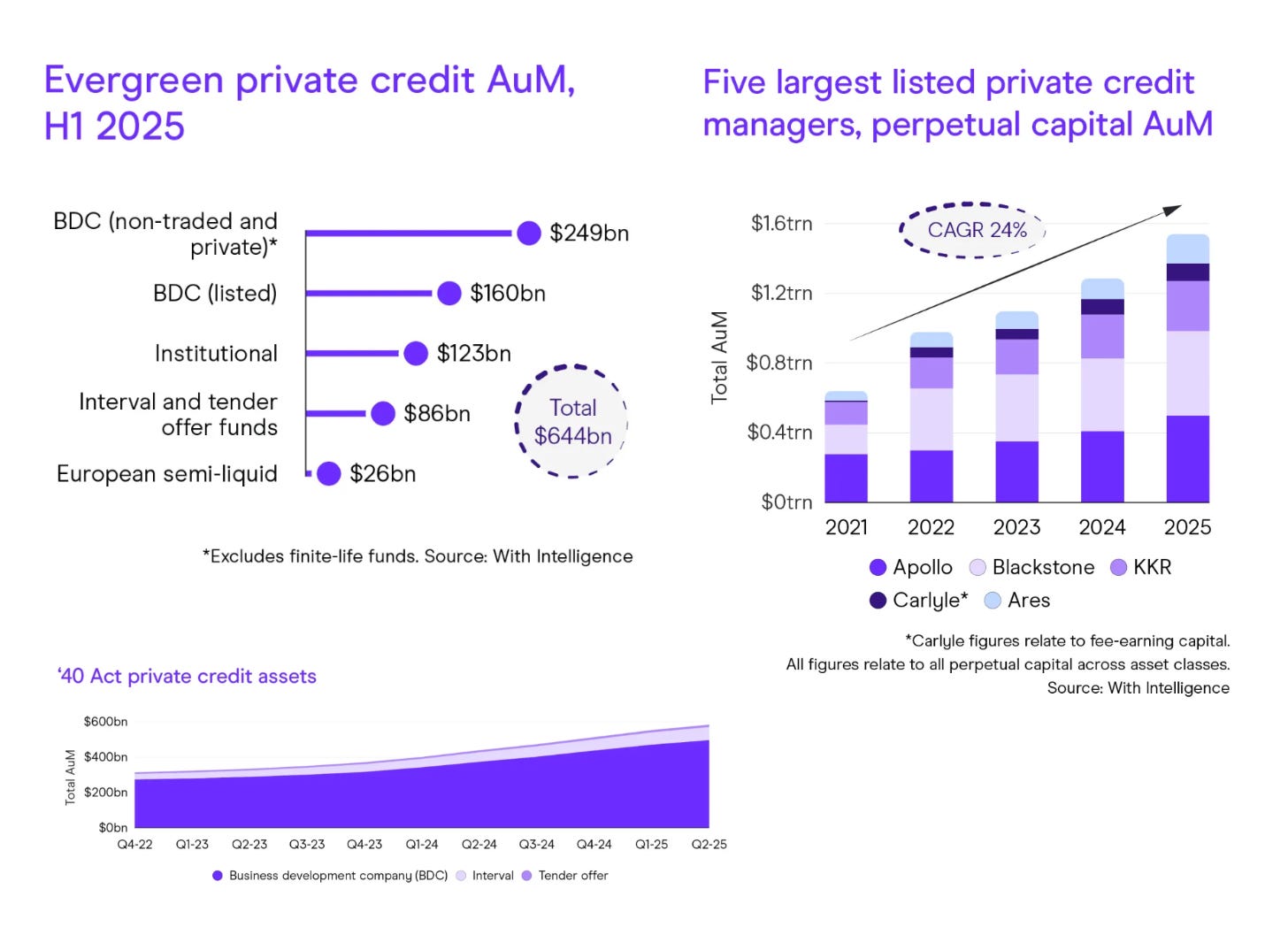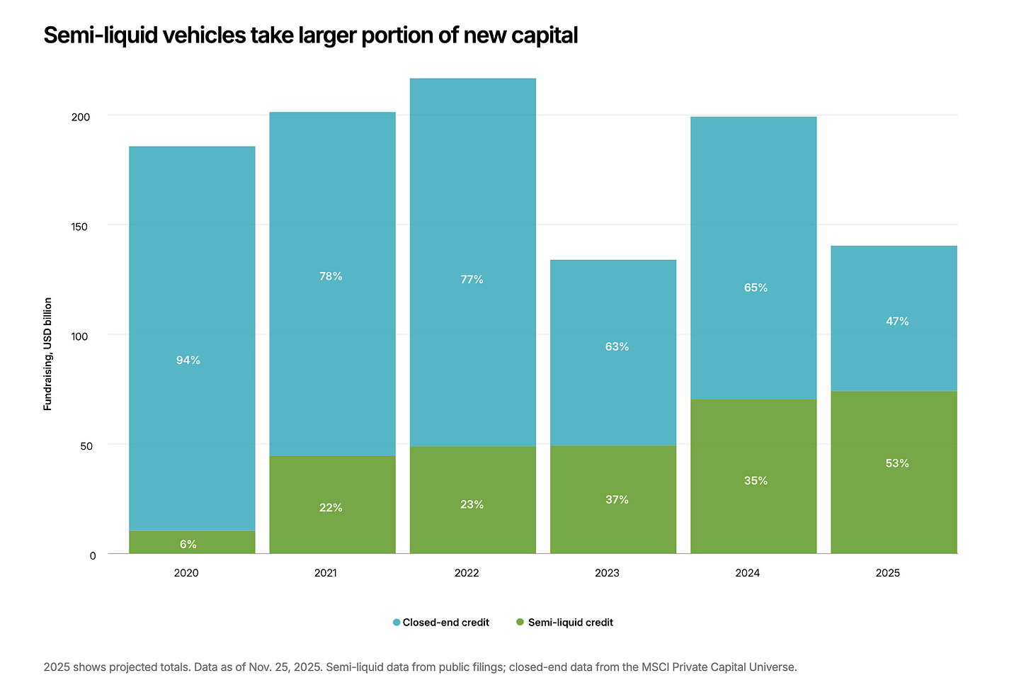 Semi-liquid private credit vehicles are capturing a larger share of new capital flowing into private markets. (Old news for long-time readers, but our subscriber base is up 43% in 90 days, so worth repeating for the recently arrived)