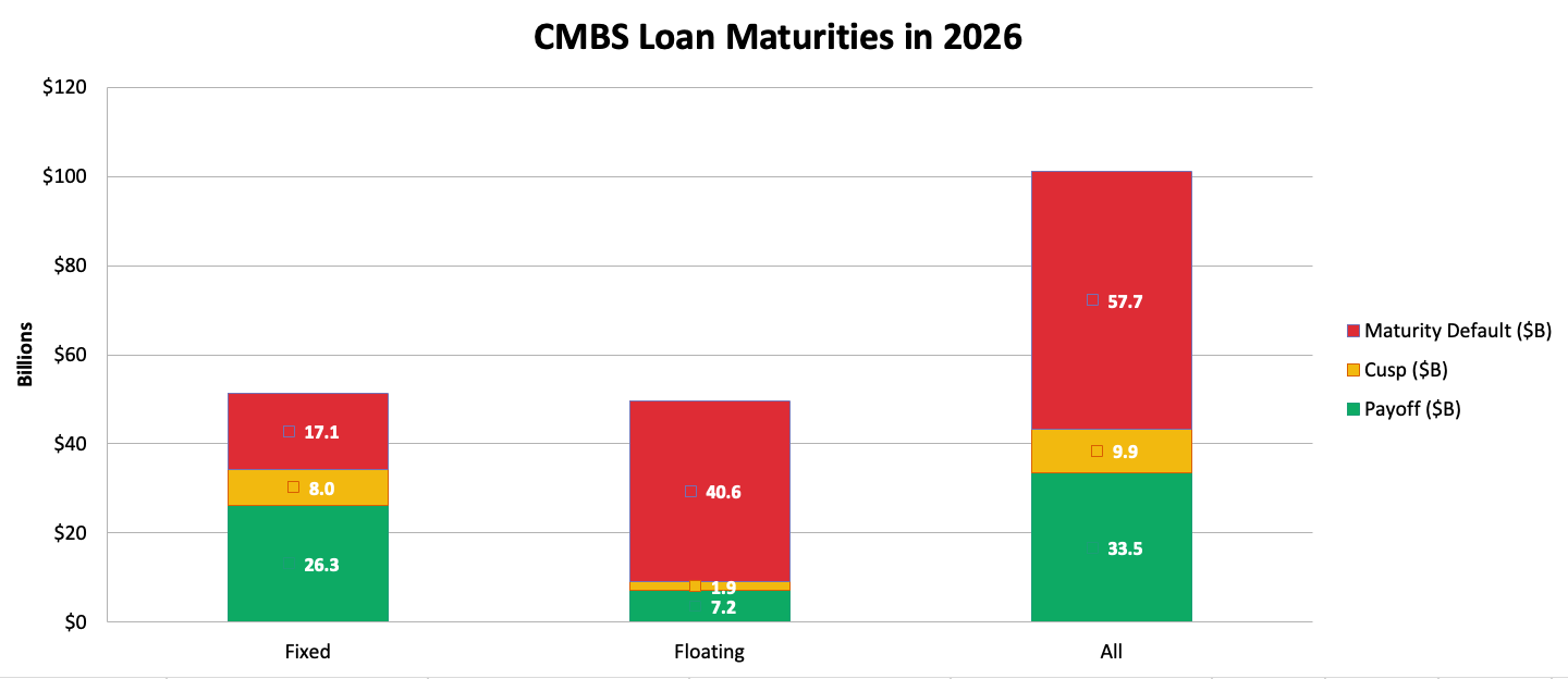 The broader picture: Morningstar estimates over $100 billion in total CMBS maturities in 2026, with roughly $57.7 billion likely to default at maturity.