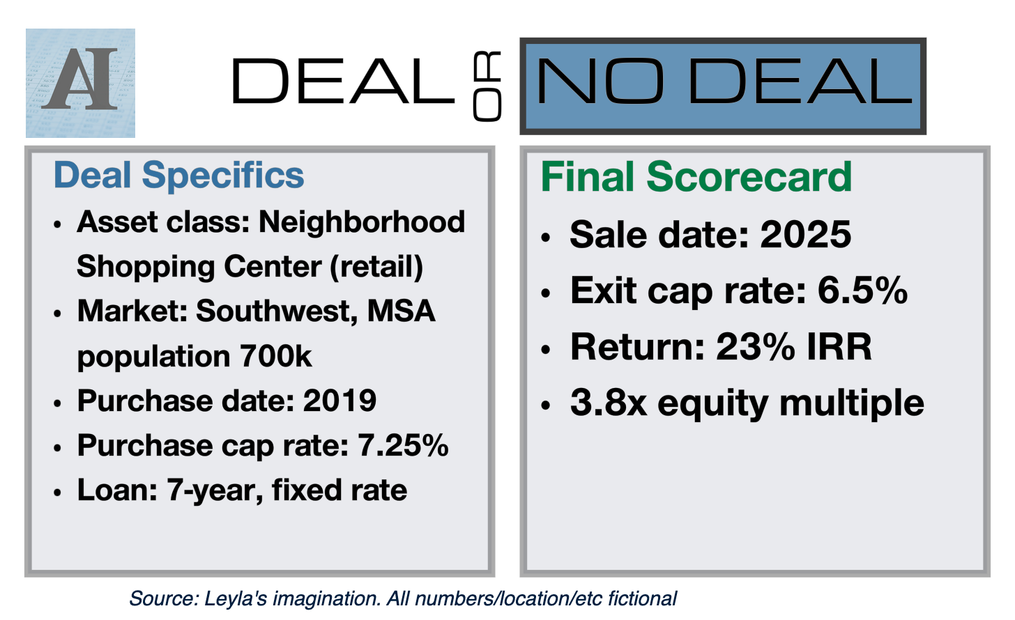 Yes, some of the returns came from cap rate compression, but one could make a strong argument the GP made the property more attractive to an institutional buyer by stabilizing it, and brining in higher quality tenants. There is a lot to be said about selecting the right location, as well.
