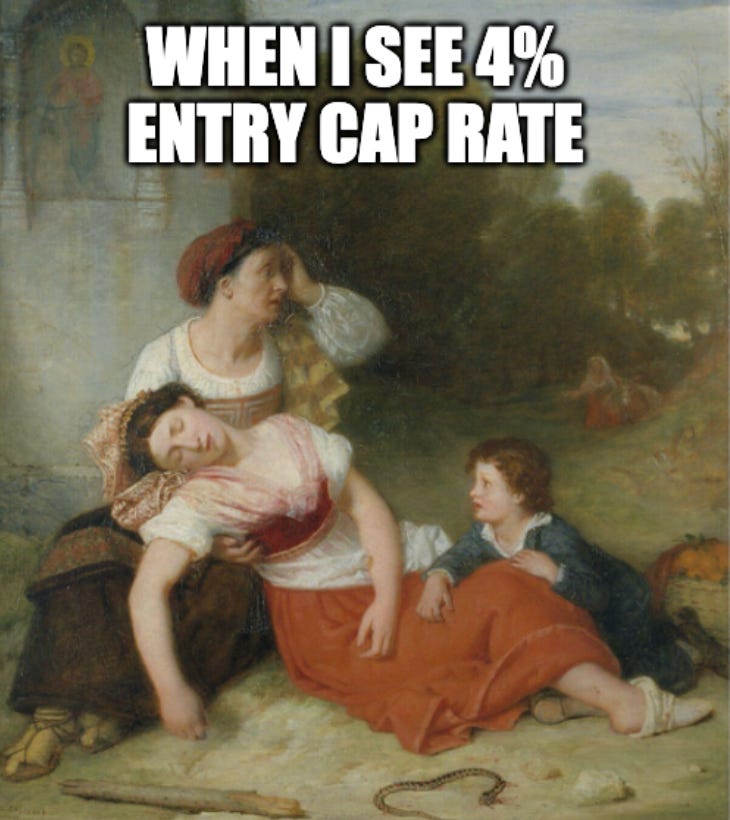 Don’t faint: the entry cap rate was approximately 4% on trailing twelve-month NOI. We know this because the acquisition NOI was disclosed in the deck.