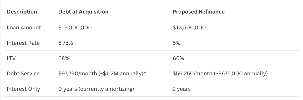 The deck does not disclose the current property valuation or the cap rate used to derive it. However, it does provide sufficient detail on the proposed refinance, which allows us to back into an implied valuation.