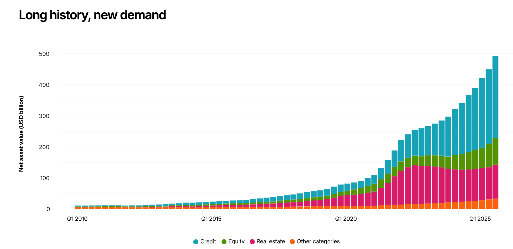Semi-liquid private market funds (interval funds, tender offer funds, non-traded BDCs and REITs) have gone from niche to nearly $500 billion in AUM, with assets growing over 30% in the twelve months through September 2025 alone. The private wealth channel now represents roughly one-fifth of total evergreen fund AUM.