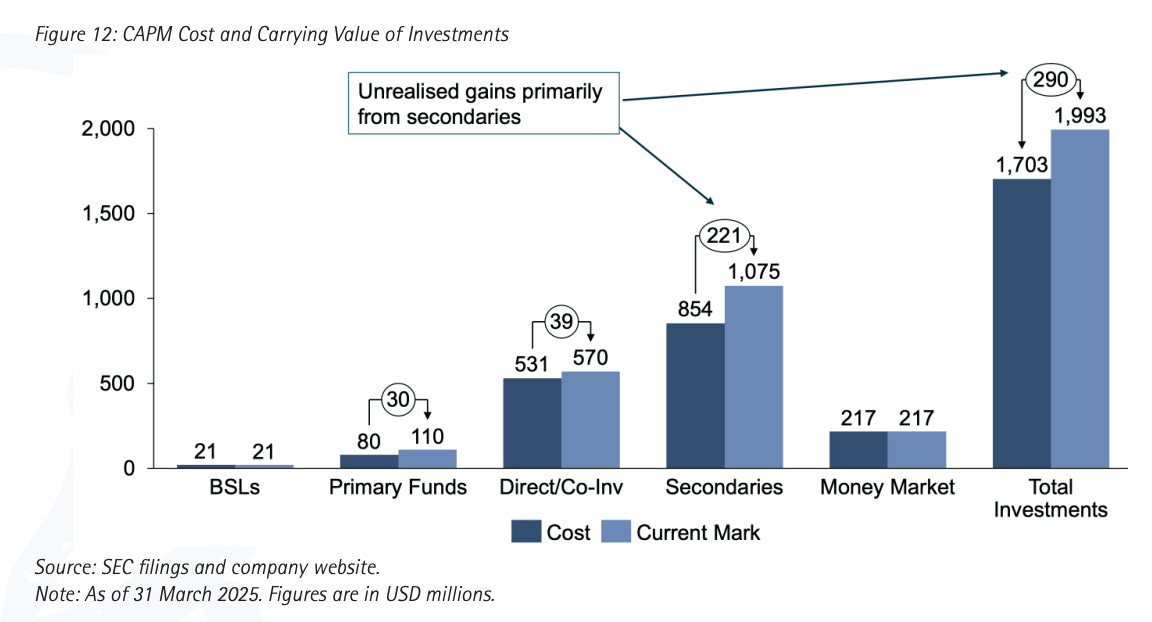 Most of that uplift came from secondaries: they make up about half the portfolio’s cost but roughly 76% of the unrealized gains. Add primary funds, and together they generate $251 million of the total. Directs and co-investments, despite being nearly a third of the cost base, contribute only about 13–14% of the gains.