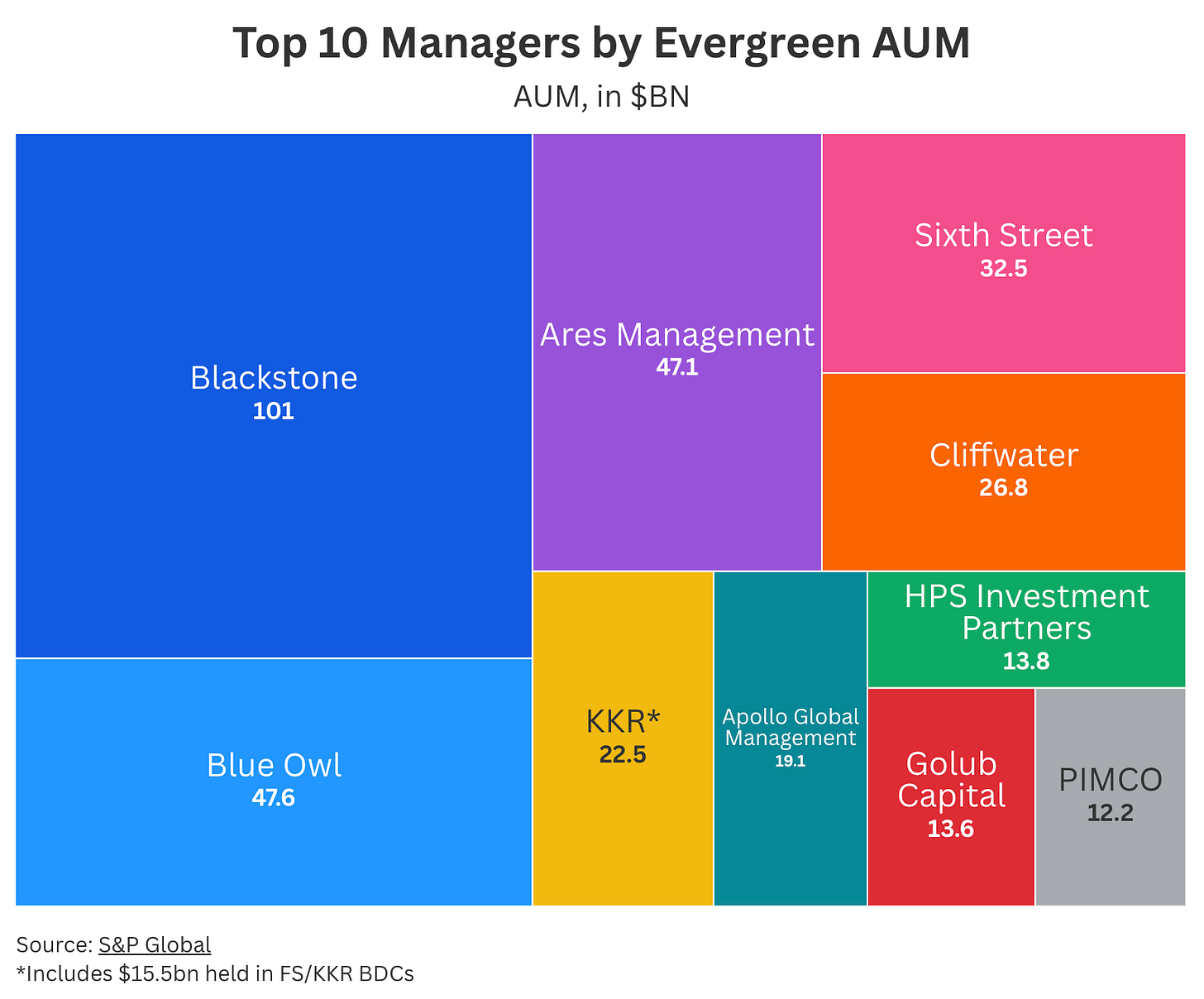 I think you may be missing Partners Group in the Evergreen Funds AUM chart. Their Evergreen Fund, Partners Group Private Equity (Master Fund), LLC, had a NAV of 15.8B on its latest N-CSR.