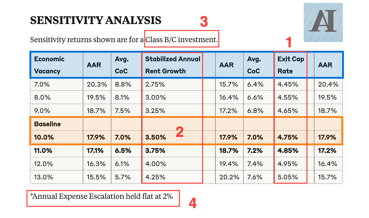 Exit cap rate range: 50 basis points, in 5-point increments.