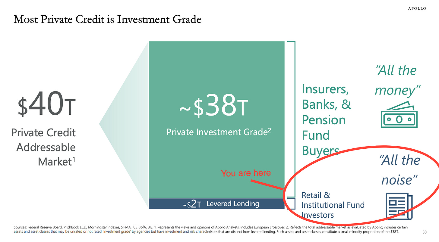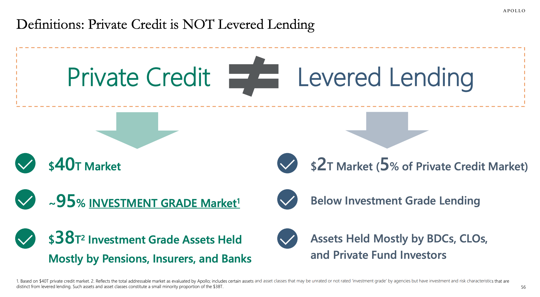 âConclusion: Private Credit is Predominantly Investment Grade (95% / $38 Trillion). Levered Lending is a Small Slice (5% / $2 Trillion). Levered Lending is Just an Investment, With Limited Held on the Balance Sheets of Banks or Other Financial Institutions.â