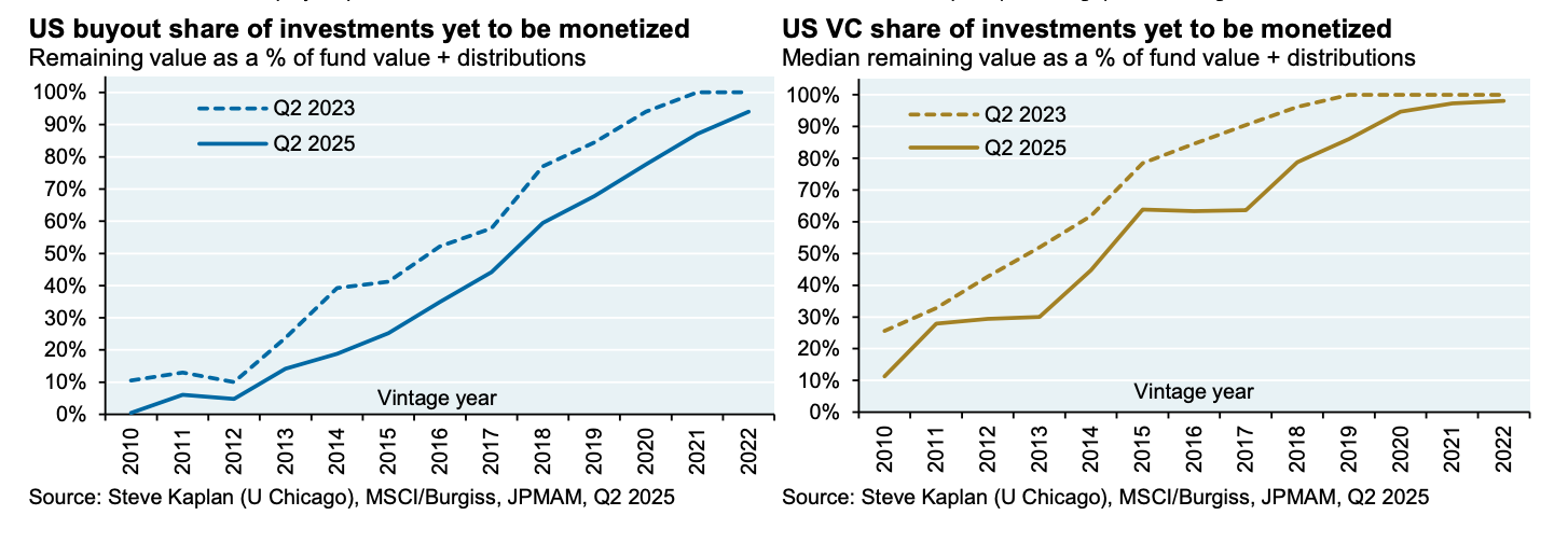 Many funds raised 2016â2019 still hold companies that havenât been sold. In venture, most value hasnât been realized: less than a third of a typical 2018 fundâs value has been cashed out.