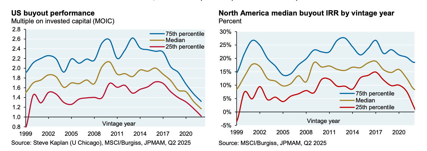 Buyouts: 1999â2019 median MOIC hovered around 2x with IRRs of 15â20%. Recent vintages are harder to gauge, as many funds are still in their commitment periods.