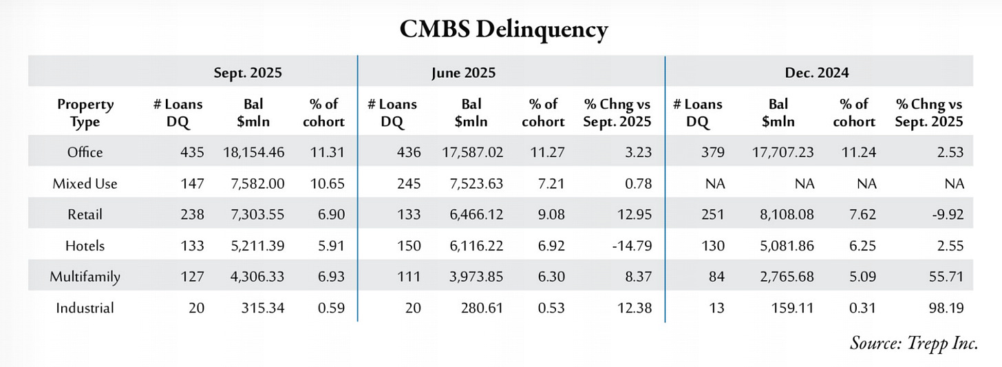 Trepp’s latest quarterly data review shows CMBS delinquencies (30+ days past due) rising to $43.52B, up from $38.13B at year-end 2024. The overall delinquency rate now sits at 7.24%, up from 6.57% at the end of 2024, though slightly down from August.
